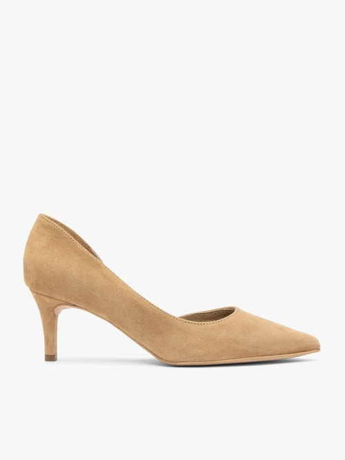 • Beżowe czółenka damskie wykonane ze skóry welurowej łączą klasyczny wygląd z elegancją. Model na 6,5 cm szpilce jest wsuwany, co ułatwia zakładanie i gwarantuje komfort noszenia. Gumowy spód zapewnia przyczepność, a nosek w szpic nadaje butom smukły i kobiecy charakter. Idealne do pracy, na spotkania czy wieczorne wyjścia – wszechstronny model łączący wygodę z wyrafinowanym stylem.Skóra welurowa