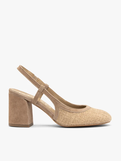 • Beżowe czółenka damskie z tkaniny i skóry welurowej z odkrytą piętą łączą wygodę z elegancją. Model wsuwany z okrągłym noskiem, obcasem 7,5 cm typu słupek oraz gumką przy cholewce zapewnia stabilność i komfort noszenia przez cały dzień. Pasek skórzany nad piętą oraz ciekawa cholewka z materiału nadają butom wyjątkowego charakteru. Wyposażone w technologię R.SILENCE, tłumią drgania i redukują hałas fleków. Gumowy spód oraz skórzana wyściółka i podszewka dbają o komfort stóp. Linia Ryłko gwarantuje wysoką jakość wykonania i ponadczasowy design.