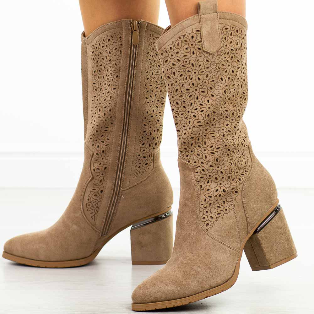 • Beżowe zamszowe ażurowe kozaki damskie na obcasieto stylowe i eleganckie obuwie idealne na wiosnę, lato oraz jesień
