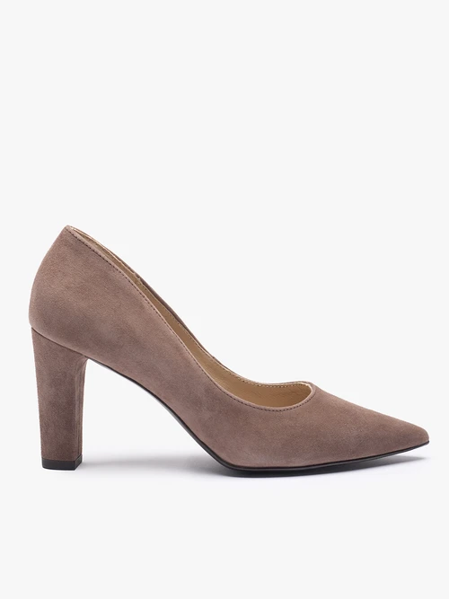 • Brązowe czółenka damskie wykonane z miękkiej skóry welurowej to klasyka, która zawsze wygląda stylowo. Smukły nosek w szpic pięknie wydłuża stopę, a stabilny obcas 8,5 cm w formie słupka dodaje elegancji bez utraty wygody. Gumowy spód oraz technologia R.SILENCE zapewniają cichszy krok i lepszą amortyzację. Wsuwana konstrukcja sprawia, że buty układają się na stopie wyjątkowo naturalnie. To model z linii Ryłko, idealny do pracy, na wieczorne wyjścia i specjalne okazje.Dystrybutor: Brawo Sp. z o.o. ul. Dworcowa 19, 34