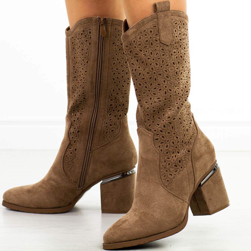 • Coffee zamszowe ażurowe kozaki damskie na obcasieto stylowe i eleganckie obuwie idealne na wiosnę, lato oraz jesień