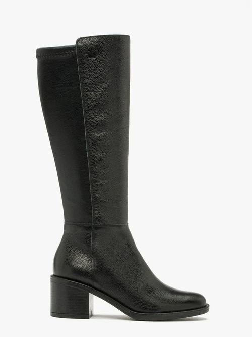 • Czarne kozaki z linii RYŁKO RELAX.Część obuwia przylegająca do stopy wykonana ze skóry licowej, a cholewka wykonana z syntetycznej skóry licowej.Obcas o wysokości 6 cm.Nosek okrągły.Podszewka wykonana z włókniny i tkaniny, a wyściółka z włókniny.Buty ocieplane włókniną.Zamek na całej długości cholewki.Wersja z szeroką cholewką