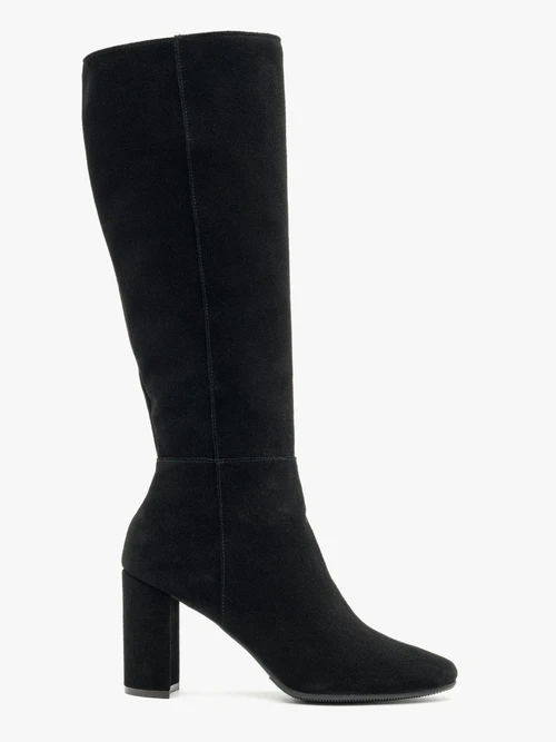• Czarny kozak na obcasie z linii RYŁKO.Model wykonany ze skóry welurowej.Buty ocieplane włókniną.Obcas oblekany o wysokości 8,5 cm.Nosek okrągły.Zamek na całej długości cholewki.But posiada gumową wstawkę w cholewce