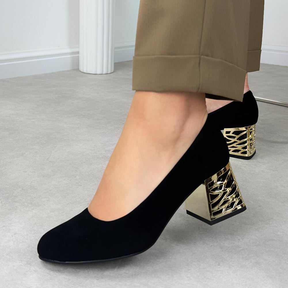 • Eleganckie czarne czółenka damskie marki Suzanato doskonała propozycja dla kobiet ceniących klasykę, wygodę i ponadczasowy styl. Model idealnie sprawdzi się jako czółenka damskie na wiosnę lato jesień, będąc świetnym wyborem zarówno na wyjątkowe okazje, jak i do eleganckich stylizacji na co dzień. Cholewka została wykonana z wysokiej jakości materiału zamszopodobnego, dzięki czemu eleganckie czółenka damskie prezentują się niezwykle stylowo i subtelnie. Wsuwana konstrukcja zapewnia wygodę użytkowania, a okrągły nosek gwarantuje komfort oraz odpowiednią przestrzeń dla palców. Wnętrze butów zostało wyposażone w miękką skórzaną wkładkę, która zwiększa wygodę nawet podczas długiego noszenia. Ozdobny złoty obcas dodaje całości wyjątkowego charakteru i sprawia, że czółenka damskie na obcasie doskonale podkreślają sylwetkę, zapewniając jednocześnie stabilność. Te modne czółenka damskie zostały starannie wykonane w Polsce, co świadczy o ich wysokiej jakości oraz trwałości. Doskonale pasują do stylizacji eleganckich i wizytowych – świetnie komponują się z sukienkami, spódnicami, garniturami oraz klasycznymi spodniami, dodając stylizacji szyku i kobiecej elegancji. Model pasuje na standardową tęgość stóp kobiet. obcas: 6 cm GWARANCJA na 12 miesięcy