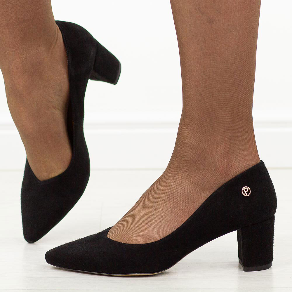 Czarne zamszowe skórzane Polskie czółenka damskie na słupku Prestige 2105 OBL – Czarny 33013