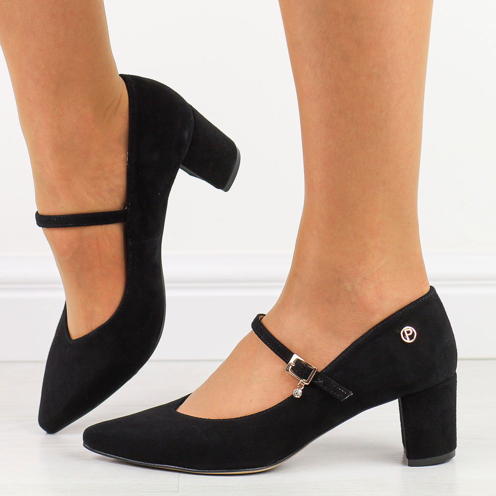 Czarne zamszowe skórzane Polskie czółenka damskie na słupku Prestige 2105 OBLP – Czarny 30155