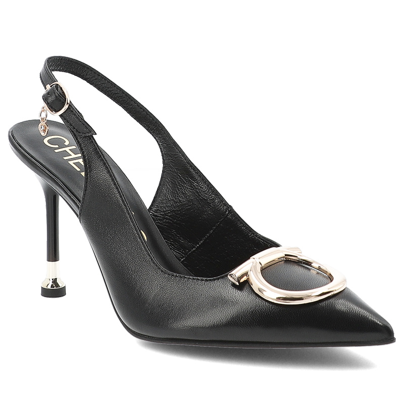 Czółenka damskie Chebello, cholewka ze skóry naturalnej z odkrytą piętą i smukłym noskiem ozdobione metaliczną klamrą osadzone na cienkim obcasie pod – czarny 19865-21