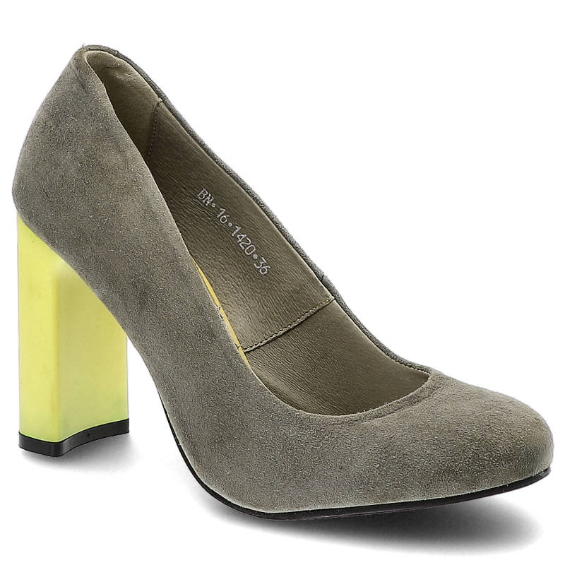 Czółenka damskie Karino, naturalny zamsz na wysokim żółtym słupku, szare, 1420-002-P – szary 4480-F