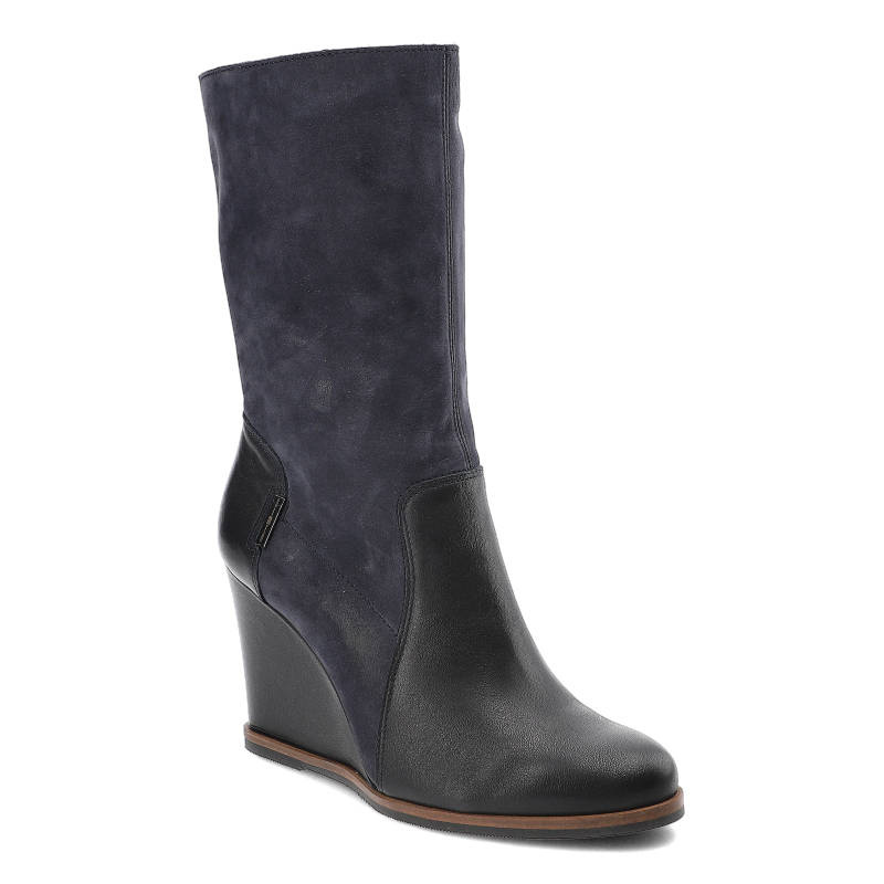• Wykonane z połączenia zamszu oraz skóry naturalnej w głębokim granacie prezentują się wyjątkowo elegancko, a dzięki koturnowi optycznie wydłużają nogi, jak również zapewniają wygodę noszenia przez cały dzień