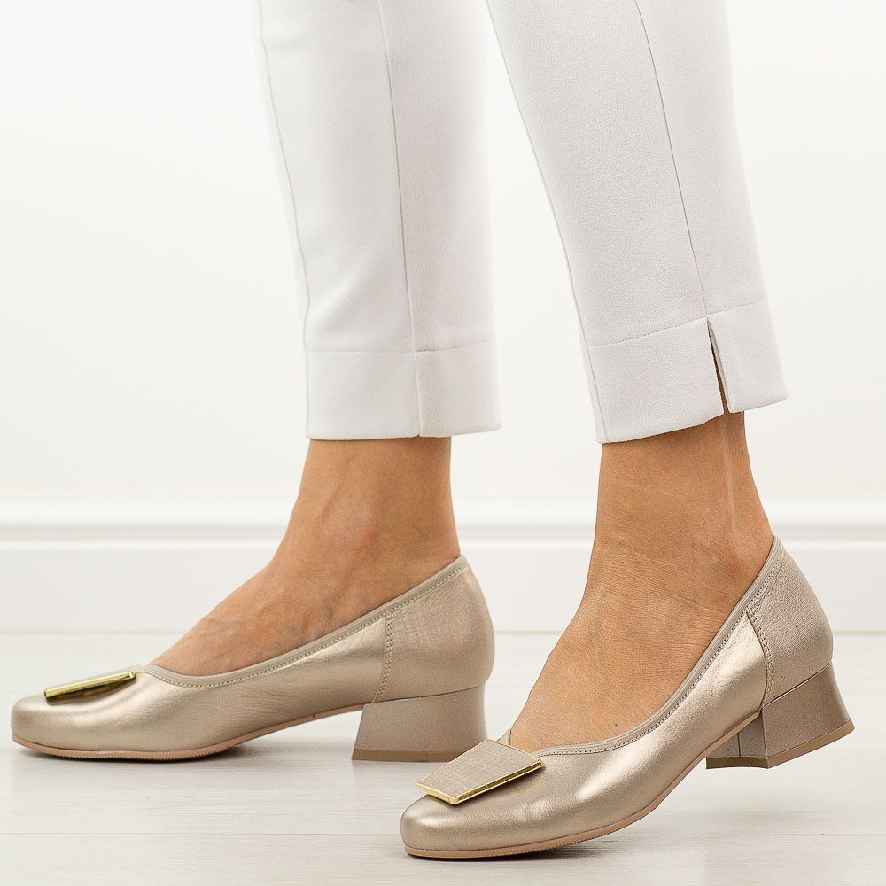 • Eleganckie i ponadczasowe perłowe czółenka damskie ze skóry naturalnej Góralto idealny wybór na wiosnę, lato i jesień, a także na różnego rodzaju okazje. Cholewka wykonana z wysokiej jakości skóry naturalnej zapewnia trwałość i komfort użytkowania, a prostokątna ozdoba z przodu nadaje modelowi szykownego charakteru. Wnętrze butów wyposażono w bardzo miękką skórzaną wkładkę, która gwarantuje wygodę nawet podczas całodziennego noszenia. Okrągły nosek zapewnia swobodę palcom, a niski, płaski obcas zwiększa stabilność i komfort chodzenia. Te eleganckie czółenka damskie wyprodukowane w Polsce są pełnowartościowe, starannie wykonane i wyróżniają się wysoką trwałością, co czyni je doskonałą inwestycją na wiele sezonów. Świetnie sprawdzą się w stylizacjach wizytowych, biznesowych oraz smart casual – doskonale komponują się z sukienkami, spódnicami, garniturem damskim oraz klasycznymi spodniami. Model pasuje na standardową oraz większą tęgość stóp kobiet. obcas: 3.5 cm GWARANCJA na 12 miesięcy