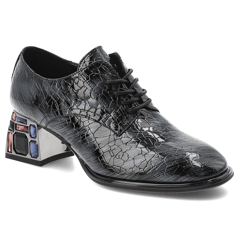 Półbuty damskie Artiker, skórzane na klocku bogato zdobione i sznurowane, szare, 57C0072 – szary 19212-B