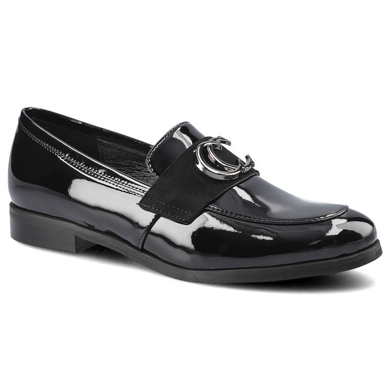 Szukasz idealnych półbutów damskich na co dzień? Model Półbuty damskie Karino, ze skóry naturalnej lakierowanej z gładką cholewką oraz ozdobnym metalowym detalem, czarne, 3849-090-P to połączenie stylu, wygody i ponadczasowego designu.