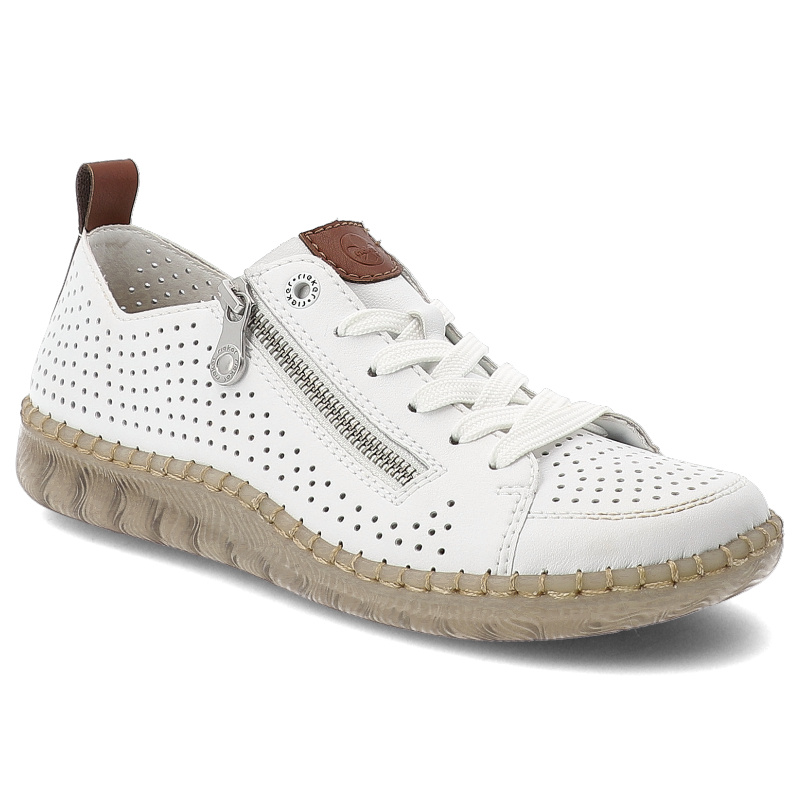Szukasz idealnych półbutów damskich na co dzień? Model Półbuty damskie Rieker, cholewka ze skóry ekologicznej perforowana powierzchnia wiązany fason z bocznym zamkiem, białe, N2405-80 to połączenie stylu, wygody i ponadczasowego designu.