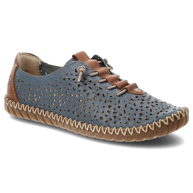 Szukasz idealnych półbutów damskich na co dzień? Model Półbuty damskie Rieker, ze skóry naturalnej z ażurową cholewką i elastyczną lekką podeszwą, niebieskie, M2856-12 to połączenie stylu, wygody i ponadczasowego designu.