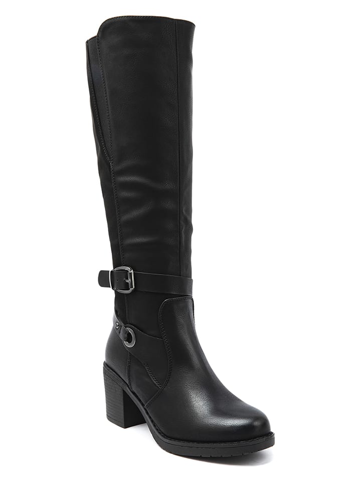 • – zapięcie: suwak- noski: zaokrąglone- noski i zapiętki: wzmocnione- detale: ozdobna klamra- forma obcasa: blokowy- podeszwa: bez profilu