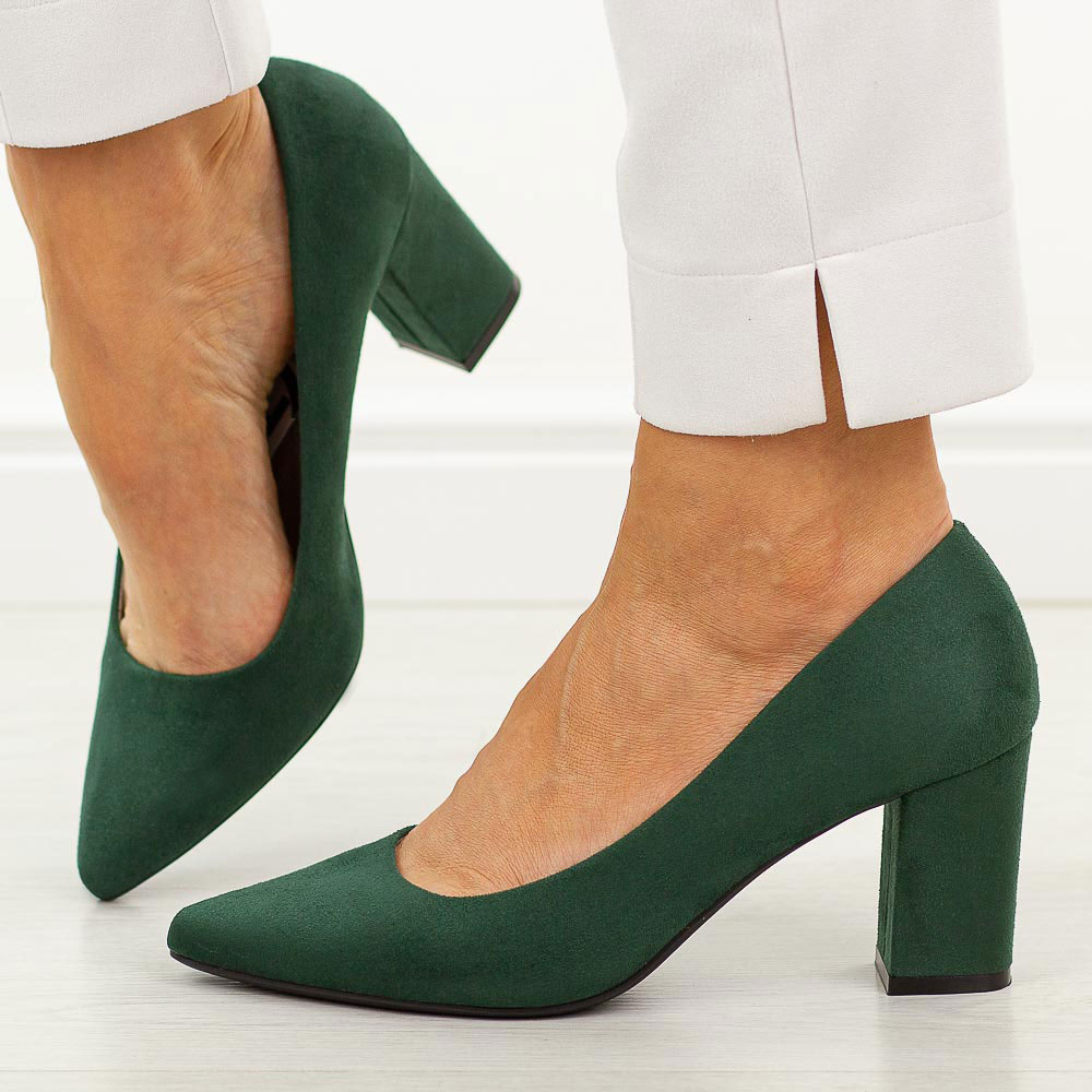 • Zielone zamszowe czółenka damskie na słupkuto ponadczasowy wybór, który doskonale sprawdzi się zarówno w sezonie wiosennym, jak i jesiennym, a także na różnego rodzaju okazje – od spotkań biznesowych po rodzinne uroczystości. Cholewka wykonana z wysokiej jakości materiału skóropodobnego zamszowego ładnie układa się na stopie i łatwo dopasowuje się do kształtu stopy. Model ten posiada elegancki nosek w szpic, który wysmukla stopę i dodaje sylwetce lekkości, a stabilny obcas typu słupek gwarantuje komfort nawet przy wielogodzinnym noszeniu. Miękka skórzana wkładka zwiększa wygodę i sprawia, że buty świetnie sprawdzają się również podczas intensywnego dnia. Te zielone czółenka na słupku są pełnowartościowe, starannie wykonane i cechują się wysoką trwałością, dzięki czemu będą służyć przez wiele sezonów. Przeznaczone są na standardową tęgość stóp kobiet, zapewniając wygodne dopasowanie. Idealnie pasują do eleganckich stylizacji – takich jak sukienki koktajlowe, garnitury damskie, ołówkowe spódnice czy spodnie typu cygaretki. Można je także łączyć z bardziej casualowymi outfitami, np. z jeansami i marynarką, tworząc klasyczny, kobiecy look na co dzień. Jeśli szukasz eleganckich czółenek na słupku, ten model będzie idealnym wyborem. słupek: 7.5 cm, wysokość buta: 14 cm GWARANCJA na 12 miesięcy