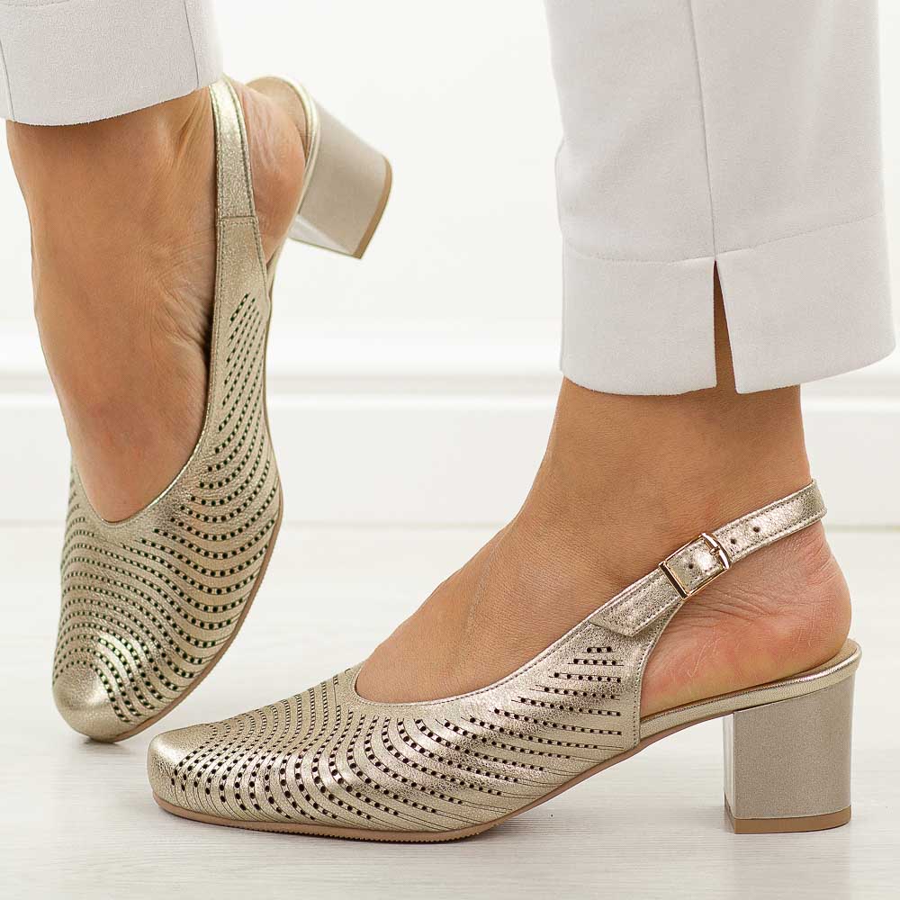 • Stylowe złote ażurowe skórzane czółenka damskie Deonito elegancka propozycja na wiosnę, lato oraz wyjątkowe okazje, łącząca lekkość z ponadczasową klasyką. Cholewka wykonana z wysokiej jakości skóry naturalnej została ozdobiona subtelnymi ażurowymi wycięciami, które zapewniają przewiewność i nadają obuwiu delikatnego charakteru. Model posiada migdałowy nosek, który optycznie wysmukla stopę, oraz odkrytą piętę, podkreślającą kobiecy styl. Wnętrze wyposażono w miękką skórzaną wkładkę, gwarantującą komfort nawet podczas długiego noszenia. Stabilny obcas dodaje elegancji i zapewnia pewność kroku. Te skórzane czółenka damskie na obcasie są pełnowartościowe, starannie wykonane i wyróżniają się wysoką trwałością, dzięki czemu doskonale sprawdzą się podczas uroczystości, przyjęć czy spotkań biznesowych. Idealnie komponują się z sukienkami koktajlowymi, spódnicami midi, eleganckimi garniturami damskimi oraz stylizacjami w stylu smart casual. Model wyprodukowany w Polsce, przeznaczony na standardową tęgość stóp kobiet. obcas: 5.5 cm GWARANCJA na 12 miesięcy