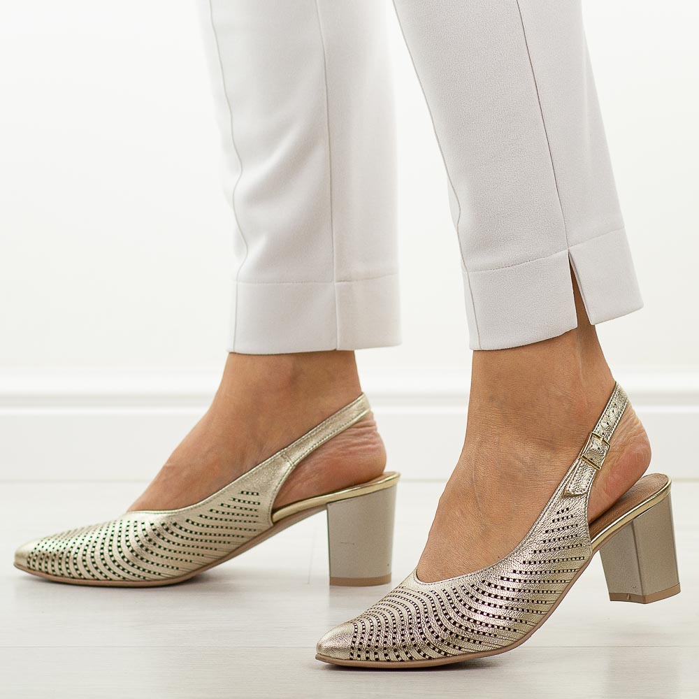 • Wyjątkowe złote ażurowe skórzane czółenka damskie Deonito elegancka propozycja na wiosnę, lato oraz wyjątkowe okazje, która łączy styl i komfort. Cholewka wykonana z wysokiej jakości skóry naturalnej została ozdobiona subtelnymi ażurowymi wycięciami, zapewniającymi lekkość oraz przewiewność w cieplejsze dni. Smukły nosek w szpic optycznie wydłuża nogi i nadaje sylwetce elegancji. Wnętrze obuwia wyposażono w miękką skórzaną wkładkę, gwarantującą wygodę nawet podczas wielogodzinnego użytkowania. Stabilny słupek zapewnia pewność kroku oraz komfort noszenia, jednocześnie podkreślając kobiecy charakter modelu. Te skórzane czółenka damskie na słupku są pełnowartościowe, starannie wykonane i wyróżniają się wysoką trwałością, dzięki czemu sprawdzą się podczas uroczystości, przyjęć czy eleganckich spotkań. Doskonale komponują się z sukienkami koktajlowymi, spódnicami midi, kombinezonami oraz stylizacjami w duchu smart casual. Model wyprodukowany w Polsce, przeznaczony na standardową tęgość stóp kobiet. obcas: 6.5 cm GWARANCJA na 12 miesięcy
